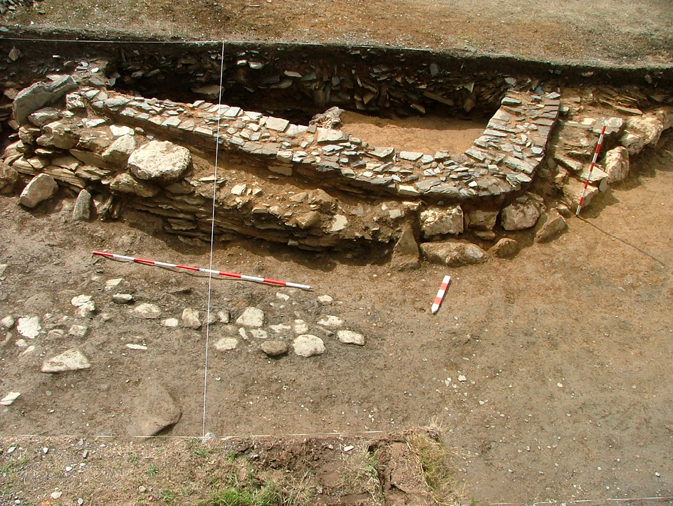 —Fase 3. Reocupación del castro (finales del s. IV d. C.-inicios del s. VI d. C.). En un momento que podemos datar en los últimos compases del s. IV y, probablemente, ya dentro de la quinta centuria se produce una segunda ocupación del castro, que perdurará hasta inicios del s.VI d. C., no más allá de la mitad de esta centuria. Es en este momento cuando se produciría una importante reestructuración que supondría, por ejemplo, la nivelación de gran parte del sitio para la instalación de nuevas estructuras, como se vería en la secuencia descrita de la entrada este. Es en estos depósitos de nivelación donde, precisamente, se localiza la mayor parte del material prehistórico procedente de la fase 1, como se atestigua en la estratigrafía analizada.