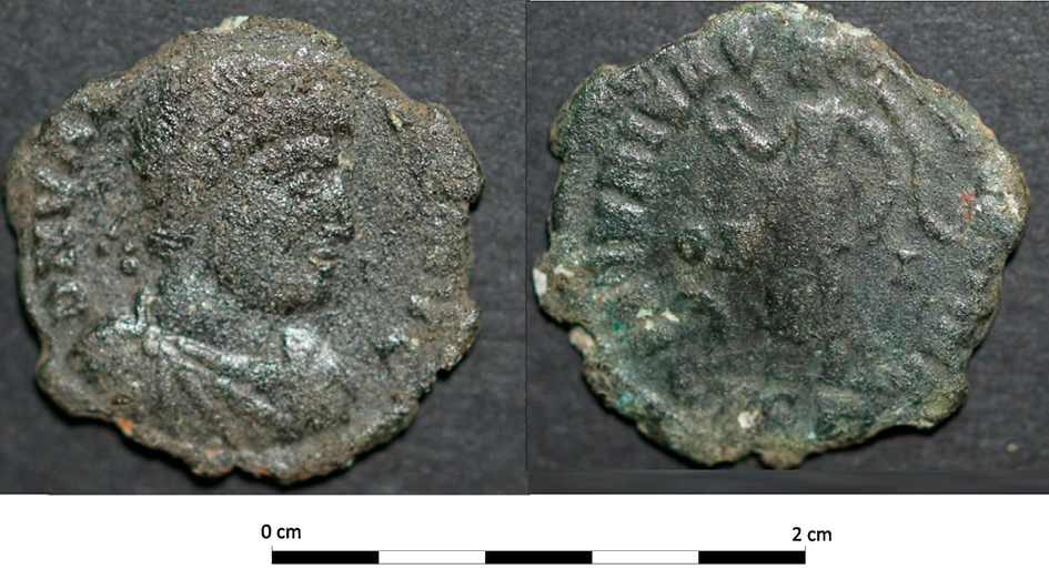 Salvo el único ejemplar de Claudio II, el resto de monedas se encuadran todas en la cuarta centuria. La moneda más moderna de Teodosio I (localizada en el estrato 13Ñ2NIIC5) arrojaría una interesante fecha post quem de finales de la cuarta centuria. Como se acaba de proponer, a partir del análisis cerámico este derrumbe se dataría ya dentro de la quinta centuria, posiblemente en su segunda mitad. Estos dos datos son plenamente coherentes en cuanto que lo que se estaría datando a partir de la cerámica serían fundamentalmente los momentos de abandono y desmantelamiento de la estructura si bien estaría muy posiblemente ocupada con anterioridad. Concretamente, en el estrato inferior 13Ñ2NIIC10 se localizaron dos fragmentos de la cadena TRC, adscribible a la quinta centuria o, incluso, a inicios de la sexta centuria. El lapso entre una datación y otra vendría dada, razonablemente, por la presencia de numerario acuñado durante el siglo IV pero atesorado en estos momentos (Marot 2000-2001). De hecho, el uso de numerario tardoimperial en contextos muy posteriores es algo bien documentado en otros contextos europeos. Por ejemplo, en un detallado estudio de la Crypta Balbi (Roma) se demostró el uso de moneda del s. III d. C. durante el s. VII d. C. (Saguì y Rovelli 1998).