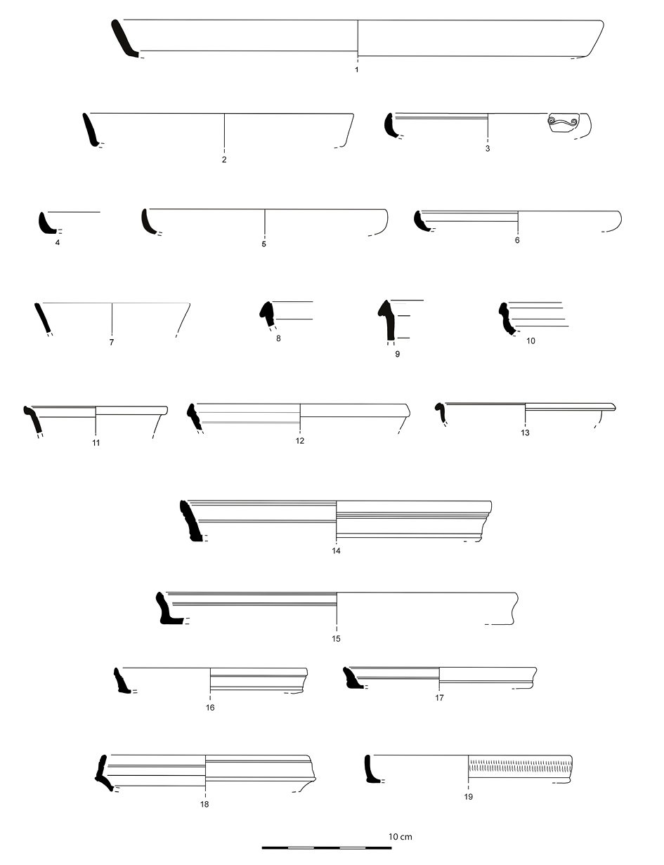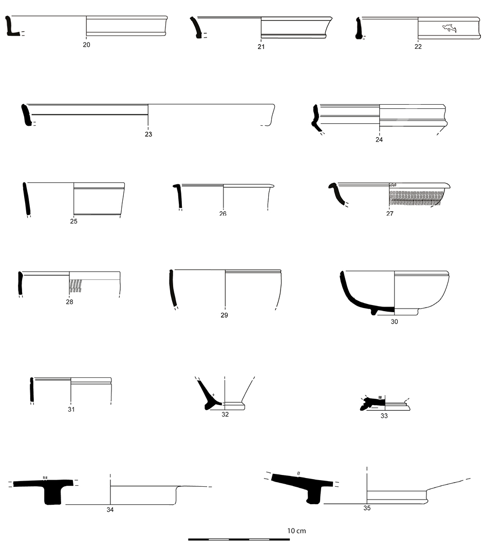ITS was still in circulation in the first half of the 1st century AD but in a smaller proportion, represented by the later forms such as Consp. 26.1 (fig. 4, no. 25), Consp. 27.1 (fig. 4, no. 26), 32.2 (fig. 4, no. 27), 33.1 (fig. 7, no. 54), to mention a few examples. The frequency of the plate Consp. 20.4, but also the presence of forms Consp. 36.4 and 37.3 with a chronology that could be extended to the second half of the 1st century, are a clear testimony of the consumption of these products in the site in a later phase of the Italian production. In fact, in this period the site must have already changed its sources of supply, obtaining products from the South Gaulish centers, namely from La Graufesenque.
