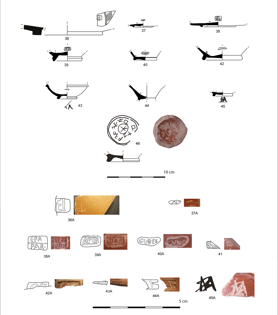 Unfortunately the internal stamps in fig 5, no. 42 is incomplete and the only thing we could read was the upper part of a possible C and V (?), also internal in planta pedis stamp in the base of Consp. 33 (fig. 5, no. 43) the same situation happens allowing only to read what seems to be the upper part of C, F ou E and A (?). Internal stamp in the base of an undetermined cup only shows the final letter I in rectangular stamp-frame with a bifid end (fig. 5, nr. 44).