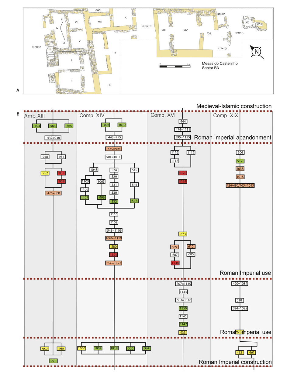 Figure 6. A. Final plan of Sector B3 in Mesas do Castelinho. B. Stratigraphic diagram of the sequence of the occupation in Sector B3: Compartments XIII, XIV, XVI and XIX (according to Fabião et al. 2012, modified).