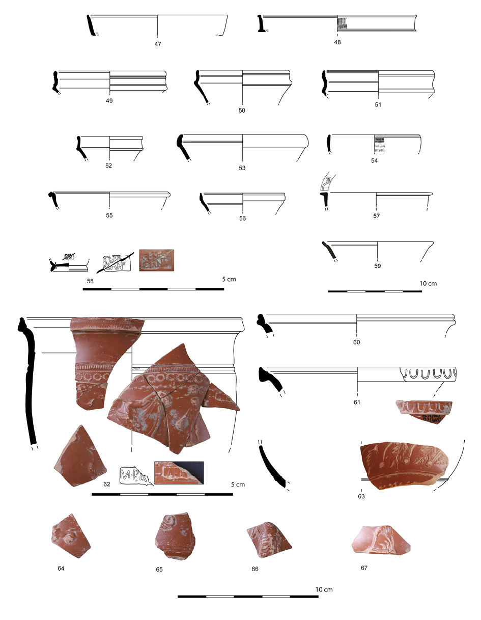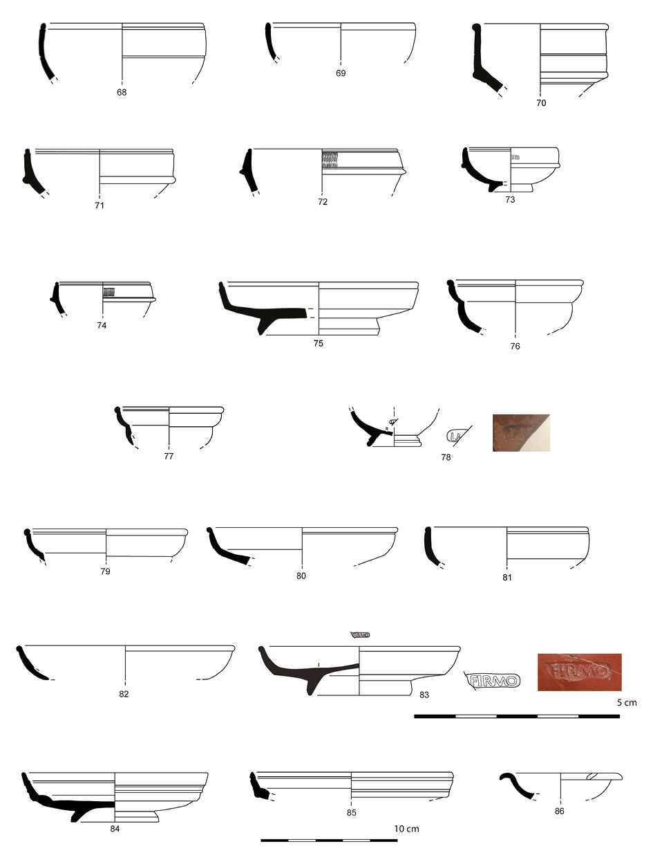 Most of the Italian-type sigillata imports must have taken place during the middle to the end of the Augustus reign, which is the period of major diffusion of Italian-type sigillata, as the distribution of forms show (tab. 2, fig. 3-5). The diversity of forms is to be highlighted and the most frequent types of this period are the plates Consp. 4.4-4.6 (fig. 3, no. 3-6), Consp. 12.4 (fig. 3, no. 10), Consp. 18, 18.2 (fig. 3, no. 14-17), Consp. 20.1-3 (fig. 3, no. 19; fig. 4, no. 20-23) and the cups of the types Consp. 22.1 (fig. 7, no. 49-51) and Consp. 22.6 (fig. 7, no. 52). Decorated chalices type R 2.1 (fig. 7, no. 61), R 4.2 (fig. 7, no. 62) and broad beaker R 11.1 (fig. 7, no. 63), are also dated from this period (Mid to Late Augustan). Late Augustan imports are particularly well represented, as will be seen infra, in the specific context that was retrieved in sector B3, in a sequence of use and remodeling of the Roman urban layout (fig. 6 and 7).