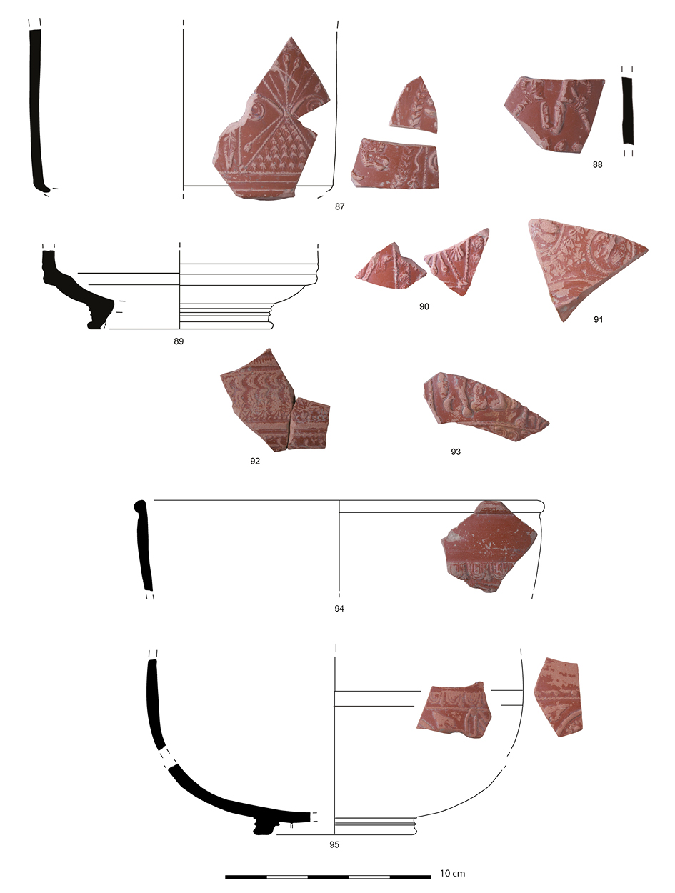 In most of the fragments it is only possible to observe a small portion of the decoration such as parts of human figures, or the line of ovolo. One of the most interesting and most well preserved pieces in this assemblage is the chalice with the Dionysiac cycle that has the intradecorative stamp of the Arretine potter M.Perenius (fig. 7, no. 62). In this piece we were able to identify the motif of the menade in profile with a robe and a thyrsus in one hand, which is similar to the punction M li 10a in Porten Palange (2004: 130, Tafel 63); in other fragments we can see the statue of Dyonisus in a second plan, holding a bunch of grapes in one hand and a thyrsus in the other, and the closest punction corresponds to mStHe fr 3s in Porten Palange (2004: 317, Tafel 170, 317). The motif of a cantharus and the figure of a felidae could also be part of the same cycle and are attributed to the work of M. Perennius, as the figure of a panter (?) is similar to the punction T/Felidae li 9a in Porten Palange (2004: 271, Tafel 152), but unfortunately these fragments couldn’t be integrated into the mentioned chalice.