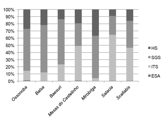 Early Italian-type sigillata imports are a reality in other inland Alentejo sites, such as Caladinho (Mataloto et al. 2014: 17-43), and Castelo da Lousa (Carvalho and Morais 2010: 139-151). In fact, in these sites, the chronology of the ITS forms and potter stamps does not extend beyond the turn of the era, as we witness their abandonment. Although in most places of today Portugal the service II of Haltern is dominant, in these Alentejo region sites it is the service I of Haltern that is the most numerous. According to R. Mataloto, J. Williams and C. Roque proposal, these sites and others located in Upper Alentejo region are part of a network of settlement previous to Roman times, which corresponds to the initial stages of the formation of the province of Lusitania (Mataloto et al. 2014: 17-43). Their military character is attested by the location, the architectural features (often with walls and associated towers), as well as the recovered materials.