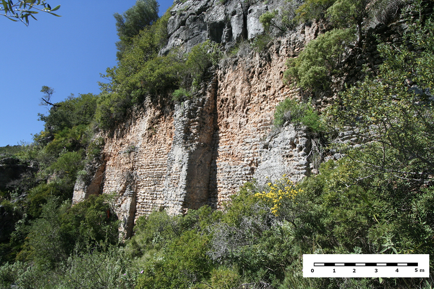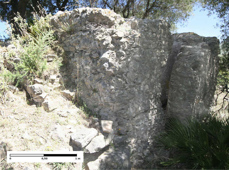 El acueducto continúa su trazado en dirección sur. Debido al desnivel que adquiere el terreno a modo de barranco, el specus discurre sobre un paredón. Está realizado con el mismo aparejo que la substructio, empleando sillarejos pequeños bien careados trabados con mortero y escuadrados, formando una pared lisa. Alterna una serie de pilares adosados a modo de contrafuertes para reforzarlo (fig. 4). Esta solución se utiliza debido al relieve accidentado por el que discurre la obra, con el objeto de mantener la pendiente del canal. La conducción prosigue adosada a esta vertiente de la sierra de Crestellina, discurriendo en dirección a Casares y más concretamente a Lacipo.