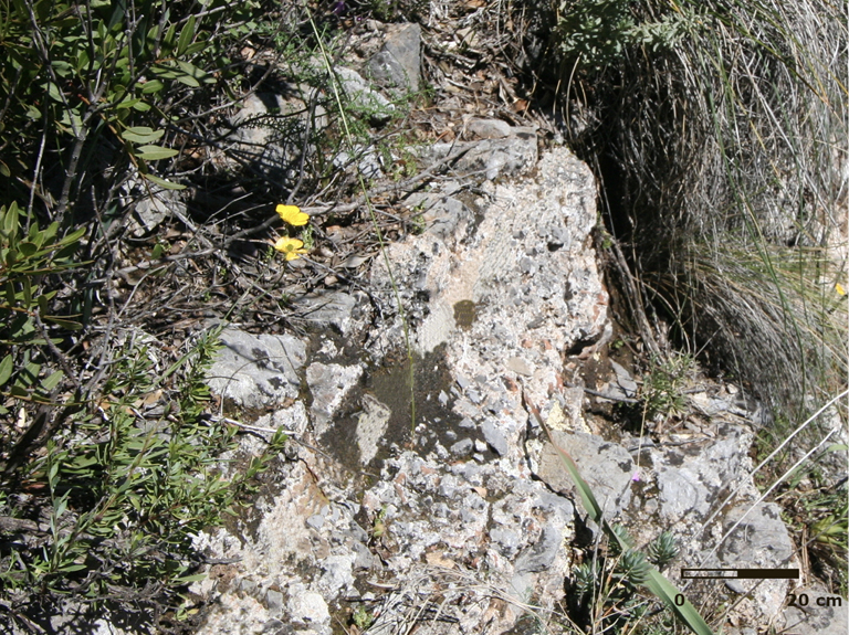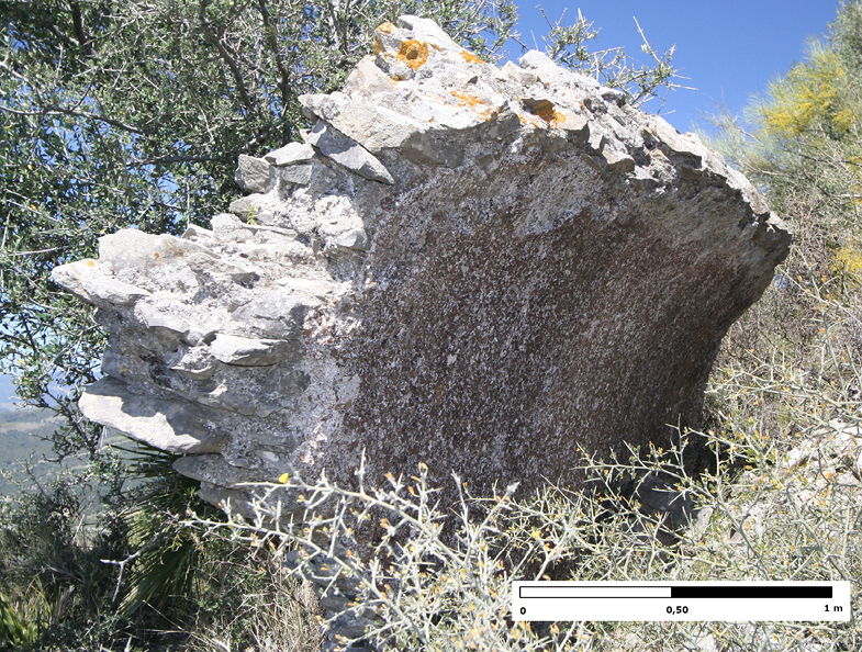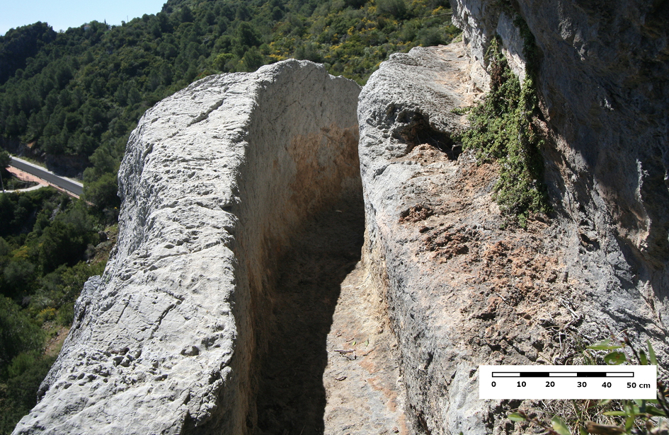 En el avance de la conducción por la vertiente este de la sierra Crestellina hacia el sur, a una altura de 418-420 m s.n.m., observamos el empleo de otra técnica constructiva. Debido a la naturaleza caliza del terreno y sus afloramientos rocosos, los salientes de la pendiente son utilizados para tallar el canal. El specus presenta unas dimensiones de 0,35 m de ancho y 0,65 m de alto, conservando huellas de talla (fig. 8). El canal excavado en la roca es una técnica minoritaria empleada en los acueductos romanos (Hodge 1992: 105-106). En general se utiliza en zonas montañosas o poco pobladas, incluso es muy usual encontrarla en conducciones destinadas a usos agrícolas e industriales. En cambio, en Hispania sí que contamos claros ejemplos de canales excavados en la roca destinados a abastecer ciudades: particularmente en la Tarraconensis, en el acueducto de Albarracín-Cella (Teruel) (Almagro 2002), en el acueducto de los Bañales (Uncastillo, Zaragoza), que incluso alberga una tubería cerámica o metálica en su interior (Beltrán 1977: 95-101), o en el acueducto de Peña Cortada (Tuéjar, Valencia) (Jiménez 1995). En Baetica, este tipo de canales se ha documentado en lugares como sierra Aznar (Arcos de la Frontera, Cádiz). Este asentamiento, localizado sobre un cerro, presenta importantes infraestructuras destinadas a la captación, conducción y almacenamiento de agua, pero cuya función no está clara (Guerrero 2001, Gener 2001). En cambio, el yacimiento no parece tratarse de un núcleo urbano, sino más bien de algún tipo de explotación de carácter minero o industrial (Mata et al. 2010).