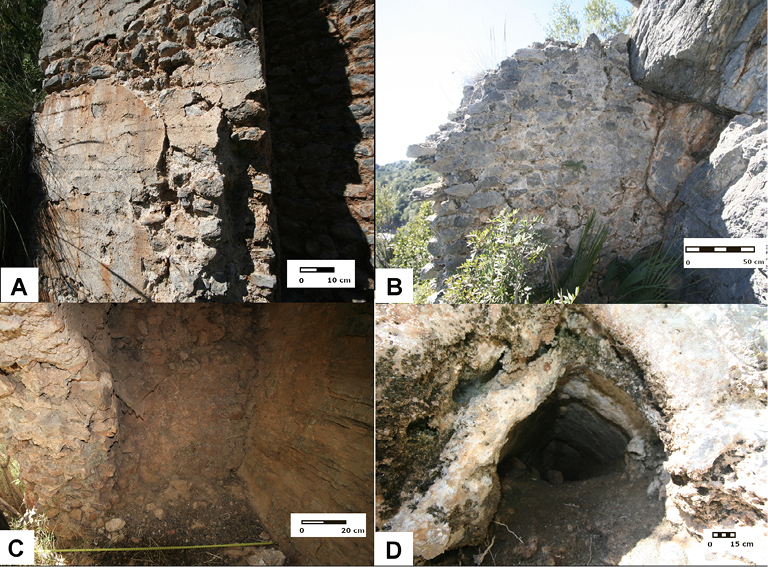 Figura 6. Detalles constructivos del acueducto. A. Enlucido exterior alisado a modo de revestimiento final en el muro de contención. B. Adosamiento del muro de contención a las rocas calizas de la ladera. C. Fractura en el muro de sillarejos que permite observar el adosamiento a la pared de la ladera. D. Aliviadero.