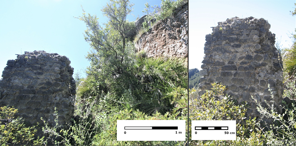 Figura 7. Izquierda: Pilar exento del acueducto en relación al muro de contención de la ladera. Derecha: Detalle del pilar.