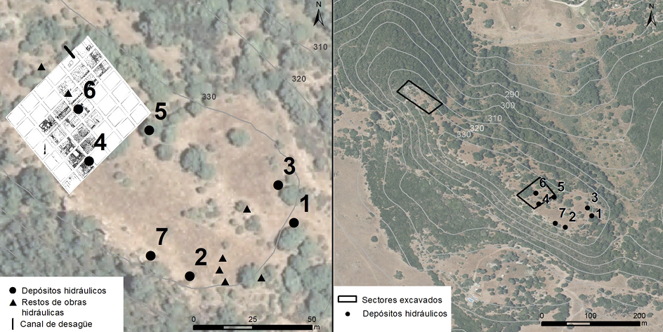 Las construcciones hidráulicas se distribuyen siguiendo una lógica topográfica, encuadrados entre los 329 y 334 m s.n.m., siempre en los límites de la zona donde se asienta la ciudad. La separación entre las mismas es regular, alternando 50 m entre las que se encuentran más alejadas, y casi 20 m aquellas más cercanas entre sí. Por tanto, el agua se concentra en un área determinada del yacimiento. Este detalle puede estar indicando el lugar donde se encontraban los edificios y construcciones a los cuales iba destinada el agua. También podría ser el punto desde donde se distribuía al resto del asentamiento, mediante pequeñas canalizaciones y fistulae.