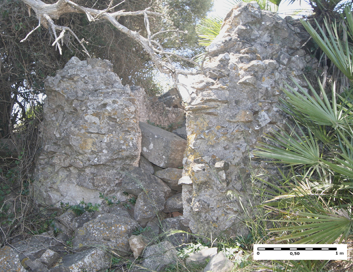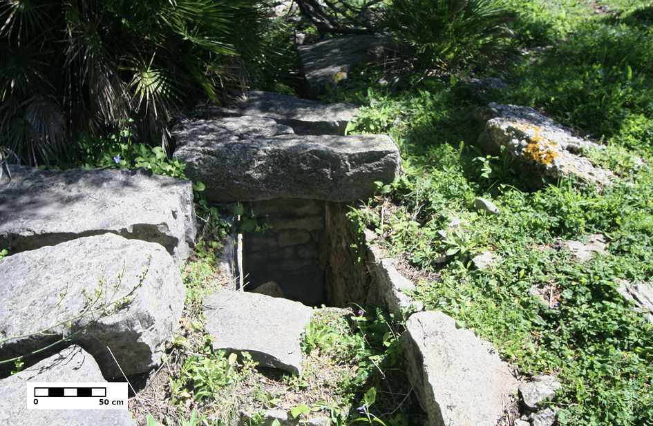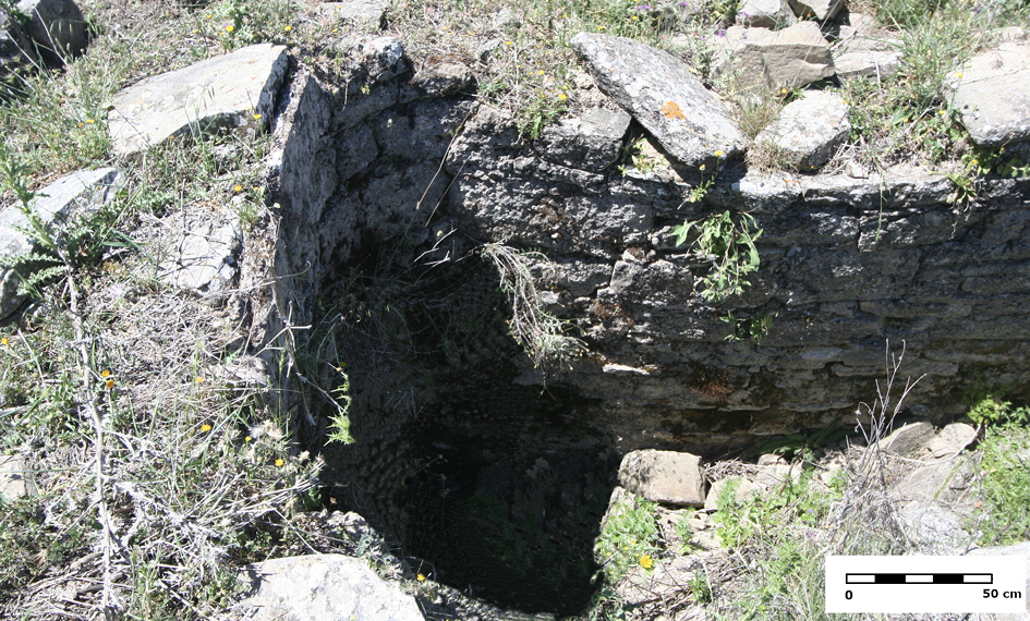 —Depósito 6: Hallado en la campaña de excavación de 1975. No ha sido posible localizarlo, por lo que la información aportada está extraída del informe arqueológico (Puertas 1982: 28). Emplazado sobre la cota 337 m s.n.m., se encuentra inserto en un conjunto constructivo y asociado a estructuras murarias. Presenta un brocal formado por piedras en alineación semicircular. El revestimiento de la cisterna es de opus signinum, alisado en su superficie. Una conducción cerámica compuesta por piezas abocinadas ensambladas era su método de alimentación. En su interior se hallaron fragmentos de cerámica y de tejas. La profundidad del aljibe alcanza los 3 m. En la información contenida en la memoria de excavación no se detalla la morfología de su planta, sin embargo, atendiendo a sus características constructivas, su ubicación y su cercanía a la anterior cisterna documentada, podría tratarse de otra cisterna a bagnarola.