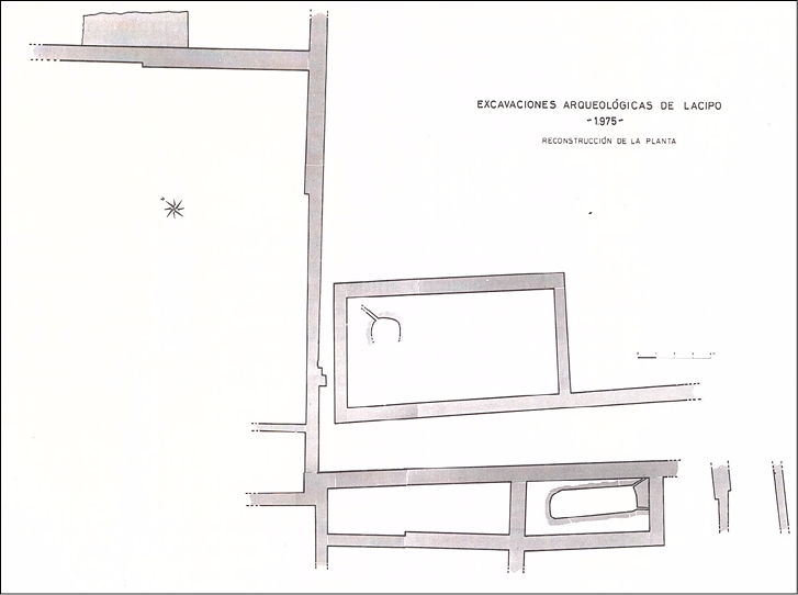 Figura 16. Reconstrucción de la planta del edificio donde se documentan las cisternas halladas en las excavaciones de 1975 (Puertas 1982: 34).