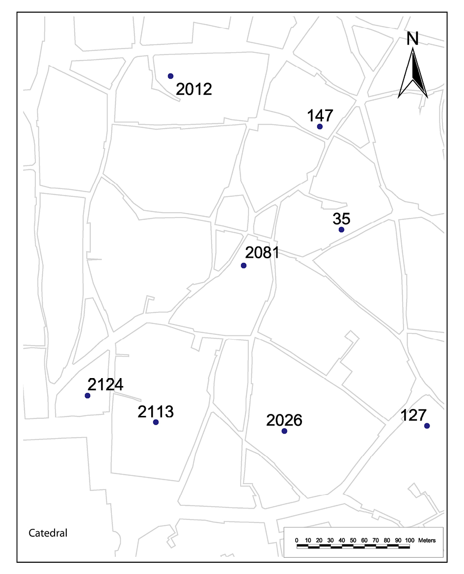 Figura 1. Excavaciones arqueológicas revisadas y su distribución sobre el parcelario actual del centro histórico de Sevilla.