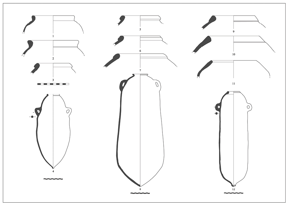Figura 2. Ánforas de producción local. Pellicer C: 1-3, 4 (prototipo de Cerro Macareno); Pellicer B: 5-7, 8 (prototipo de Cerro Macareno); Pellicer D: 9-11, 12 (prototipo de Las Cumbres).