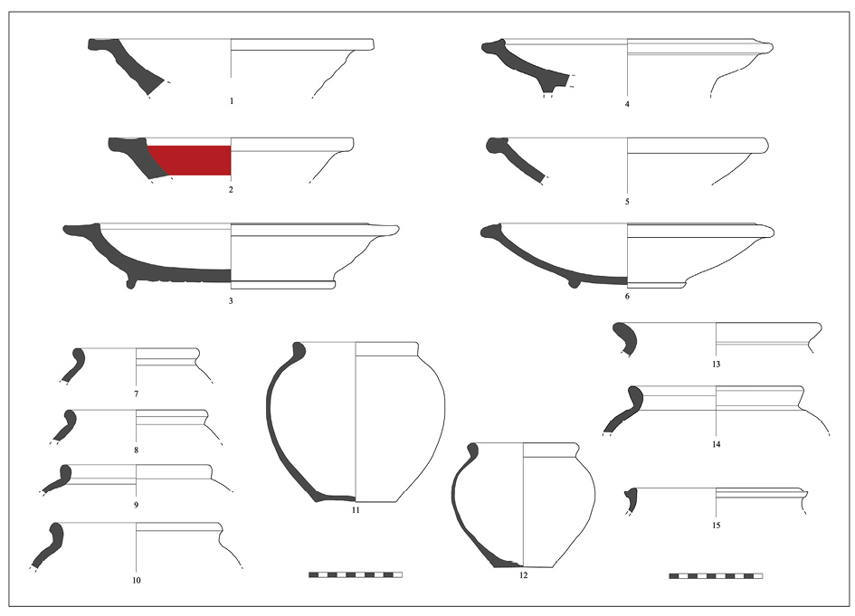 Figura 3. Cerámica de cocina de producción local. Morteros: 1, 2, 4 y 5, 3 y 6 (prototipos de Itálica); ollas de tradición turdetana: 7-10, 13 y 14, 11 y 12 (prototipos de Cerro Macareno); ollas de tradición púnica (GDR 12.3.1): 15.
