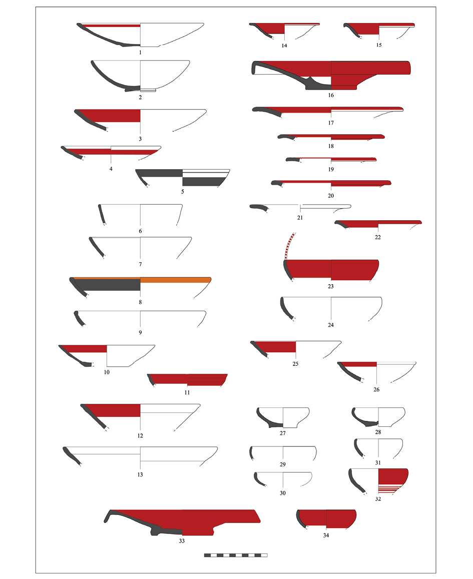 Figura 4. Cerámica común de producción local. Cuencos: 1 y 2 (prototipos de Itálica y Alhonoz), 3-6 (tipo Escacena I-A), 7-9 (Escacena I-B), 10 y 11 (Escacena I-C), 12 y 13 (Escacena I-D), 23 y 24 (Escacena I-H), 25 y 26 (Escacena I-I); platos: 14 y 15 (prototipos de Montemolín), 16 (prototipo de Alhonoz), 17-19 y 21 (tipo Escacena II-A), 20 y 22 (Escacena II-B); cuencos-lucerna: 27 y 28 (prototipos de Alhonoz e Itálica), 29-32. Vajilla gaditana tipo “Kuass”. Plato: 33 (forma Niveau II); copa: 34 (Niveau IX).