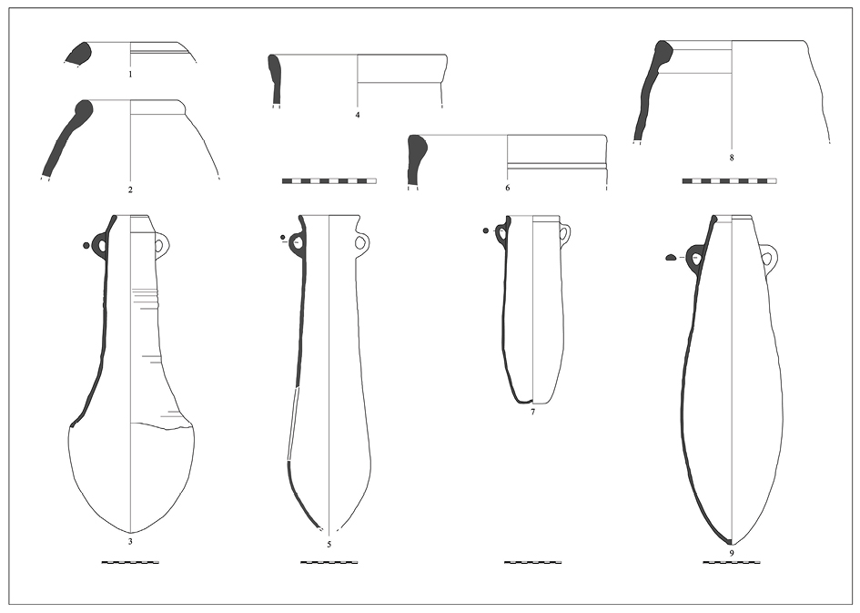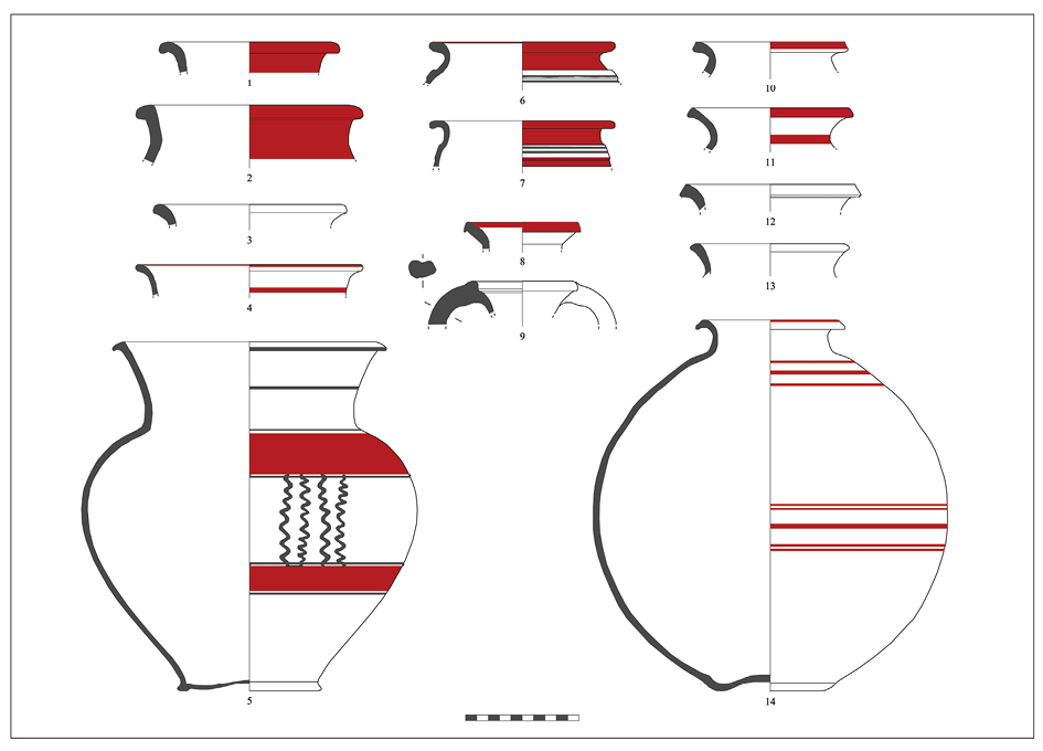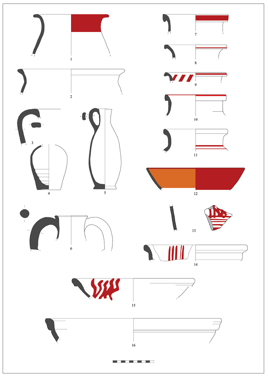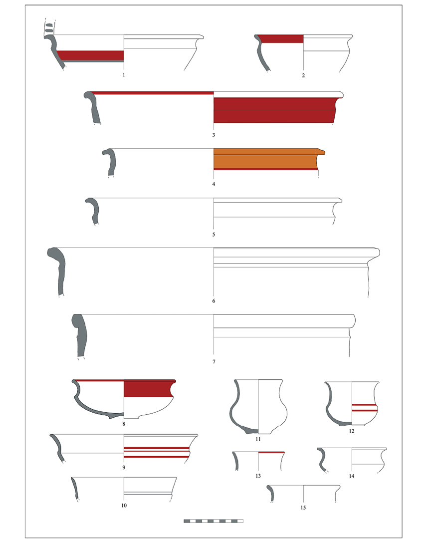 Las formas de tradición turdetana halladas en estos contextos son los lebrillos de cuello estrangulado, algunos de ellos con chorreones de pintura sobre el borde y motivos de retícula en el interior (fig. 7: 15), así como urnas de borde triangular y decoración de líneas pintadas en rojo tanto en el borde como bajo el cuello (fig. 7: 7). Las cerámicas de cocina turdetanas se componen básicamente de ollas de borde vuelto, realizadas en ambiente reductor y con abundante desgrasante. Conviven con tipos de influencia itálica, como las ollas de borde entrante y tendencia horizontal, en cocción oxidante. Las pequeñas jarras de boca moldurada, también de tradición itálica, parecen generalizarse en este momento.