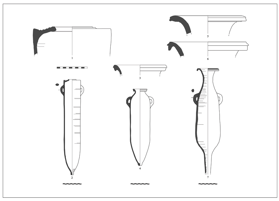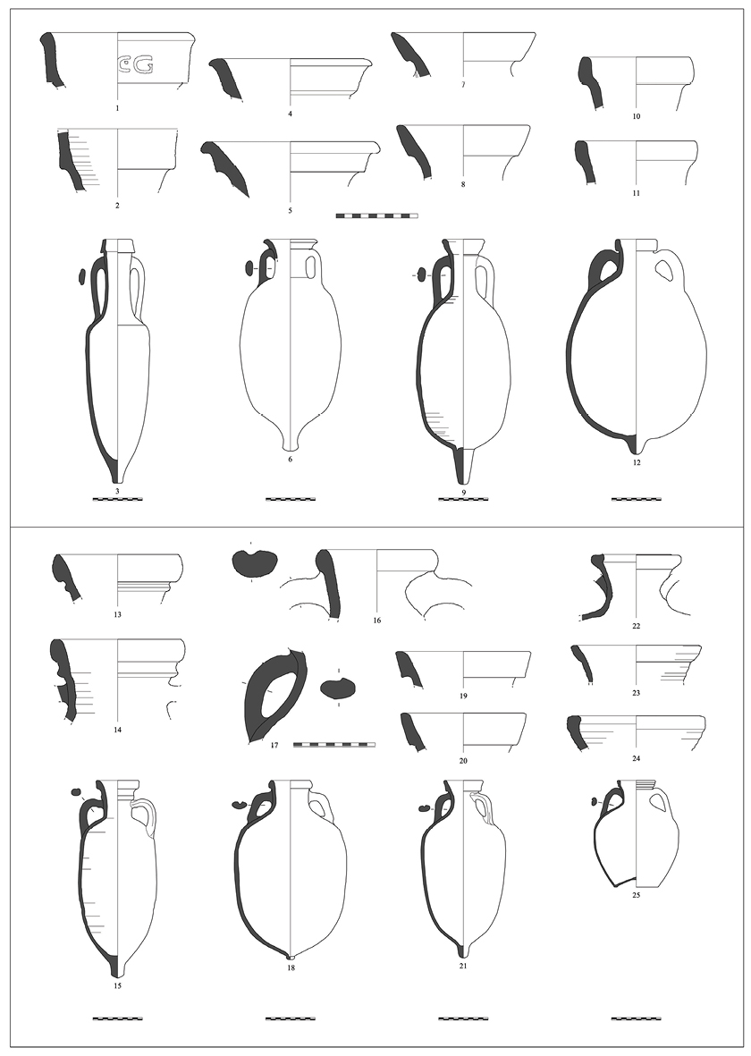 Las ánforas asociadas a este repertorio de vajilla de mesa son mayoritariamente contenedores de procedencia campana y forma Dressel 1A. El resto de las importaciones, un ánfora gadirita de la forma 9.1.1.1, un fondo de vaso itálico de paredes finas y un fragmento del cuerpo de un bol “megárico” de producción norditálica, no desdice una propuesta cronológica dentro del último cuarto del siglo II a.C.