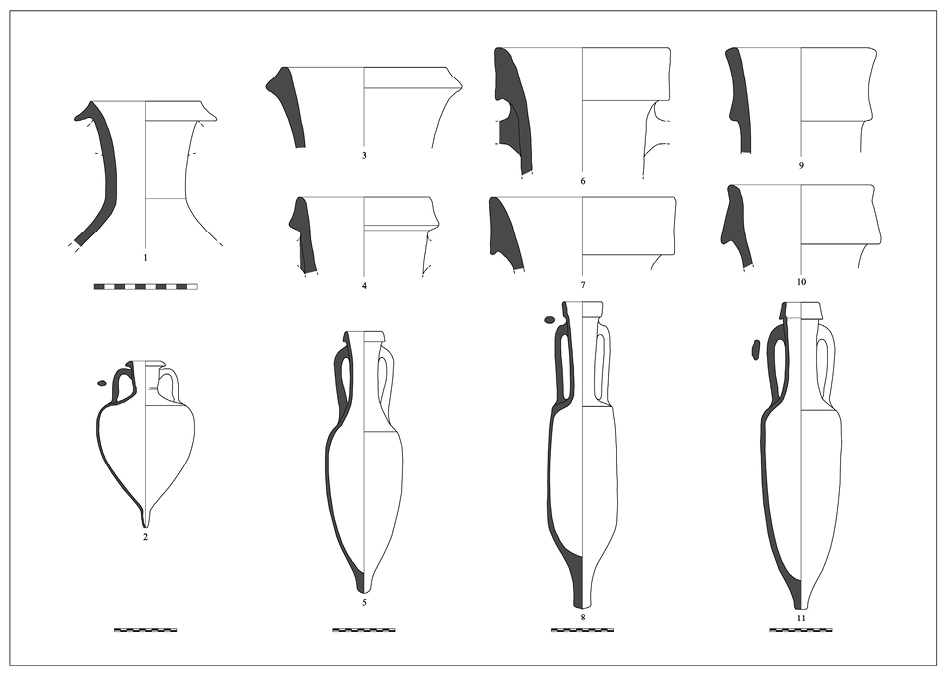 Figura 10. Ánforas de producción itálica. Grecoitálica: 1, 2 (prototipo); Dressel 1A: 3 y 4, 5 (prototipo); Dressel 1B: 6 y 7, 8 (prototipo); Dressel 1C: 9 y 10, 11 (prototipo).