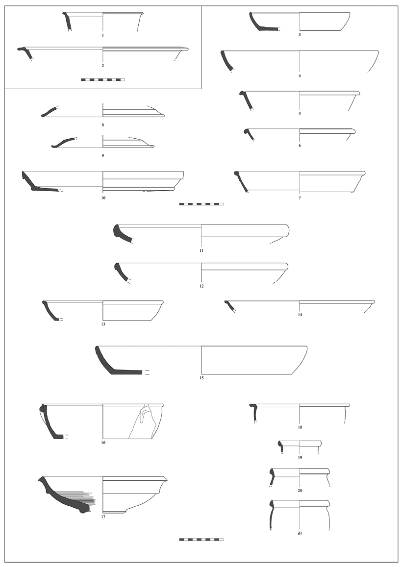 Figura 12. Cerámica de cocina de tradición itálica. Platos de borde bífido Vegas 14: 3 y 4; Emporiae 158, 15: 5; Torre Tavernera 4, 10: 6; Argote 3.694: 7; tapaderas Celsa 80, 7056: 8 y 9; sartén Celsa 84, 13596: 10; cazuelas en rojo pompeyano Luni 1: 11 y 12; Luni 2/4: 13 y 14; Luni 5: 15; plato con asas horizontales Burriac 549: 16; mortero Emporiae 36, 2: 17; cazuela Celsa 79, 28: 18; ollas Vegas 2: 19-21. Cerámica de cocina de tradición centromediterránea. Cazuela GDR 11.1.1: 1; mortero Lancel 131: 2.