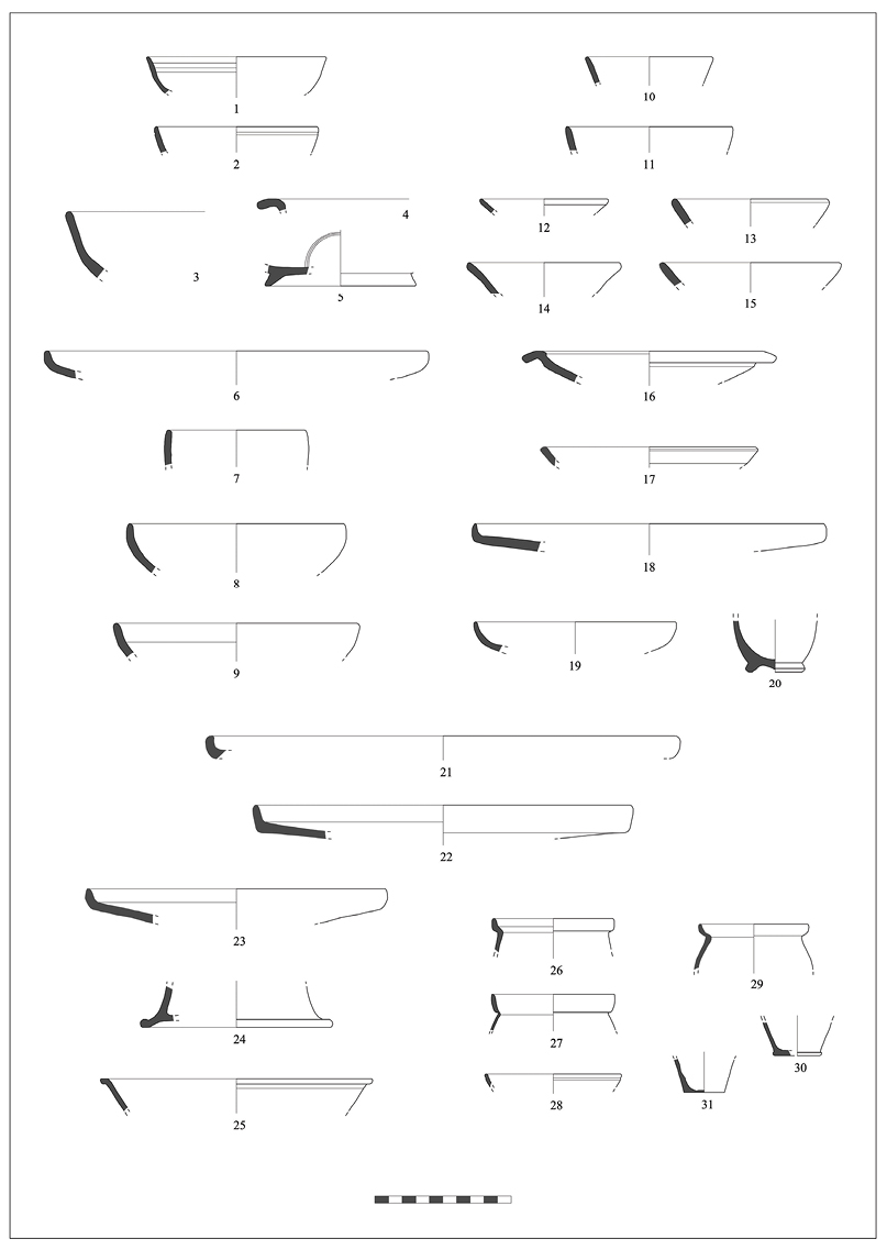 Figura 13. Vajilla de mesa itálica. Campaniense A: 1 (M. 3614); 2 (M. 3131); 3 (Lamb. 8 b); 4 (Lamb. 6); 5 (Lamb. 1); 6 (Lamb. 5); 7 (Lamb. 27 a-b); 8 (Lamb. 27 b); 9 (Lamb. 27 c); 10 y 11 (Lamb. 31 b); 12, 13 y 15 (Lamb. 33 b); 14 (Lamb. 38 a-b); 16 (Lamb. 36). Campaniense B: 17 (Lamb. 1); 18 (Lamb. 5); 19 (Lamb. 8 b); 20 (Pedroni 780). Campaniense B etrusca: 21 y 23 (Lamb. 5); 22 (Lamb. 7); 24 (Lamb. 3); 25 (Lamb. 8). Paredes finas: 26 (Mayet II-III); 27 (Mayet III); 28 (Mayet V); 29 (Mayet IV); 31 (Mayet I); 30 (Mayet I-III)